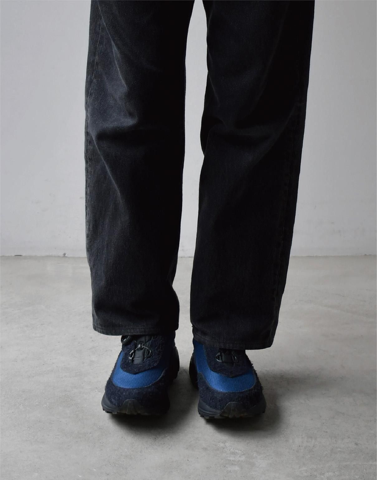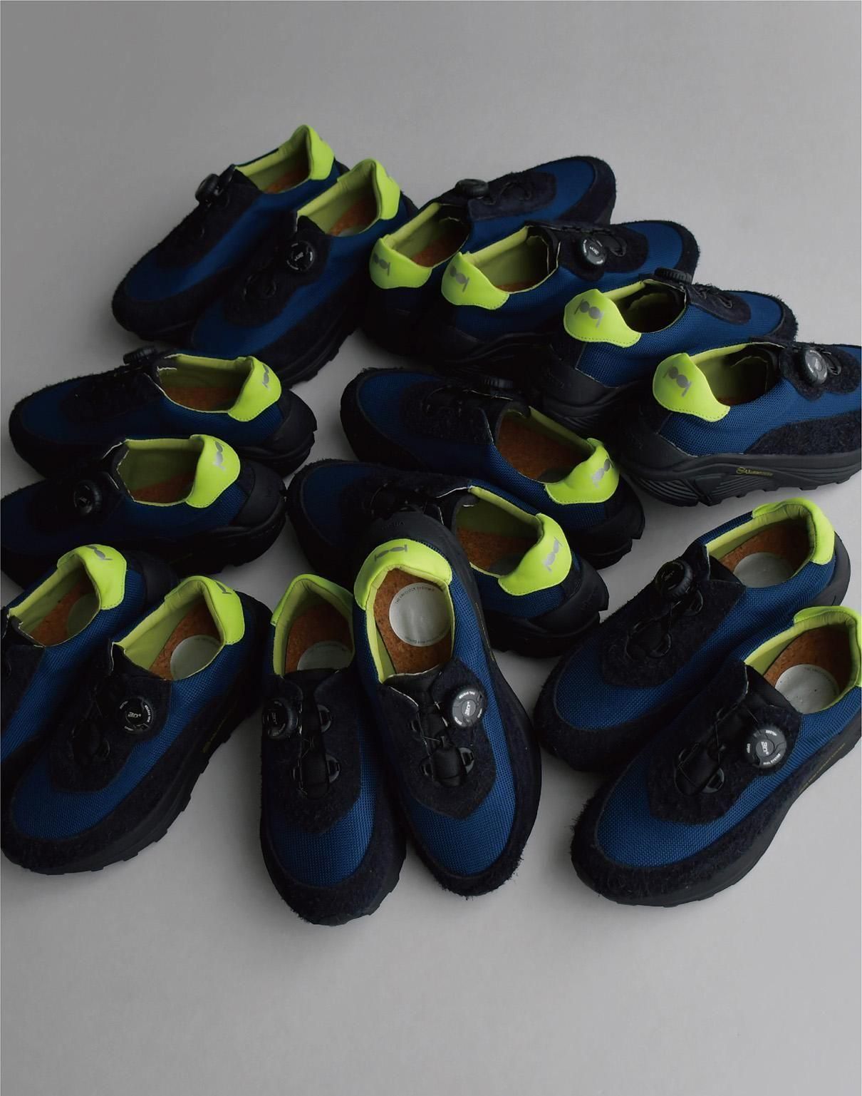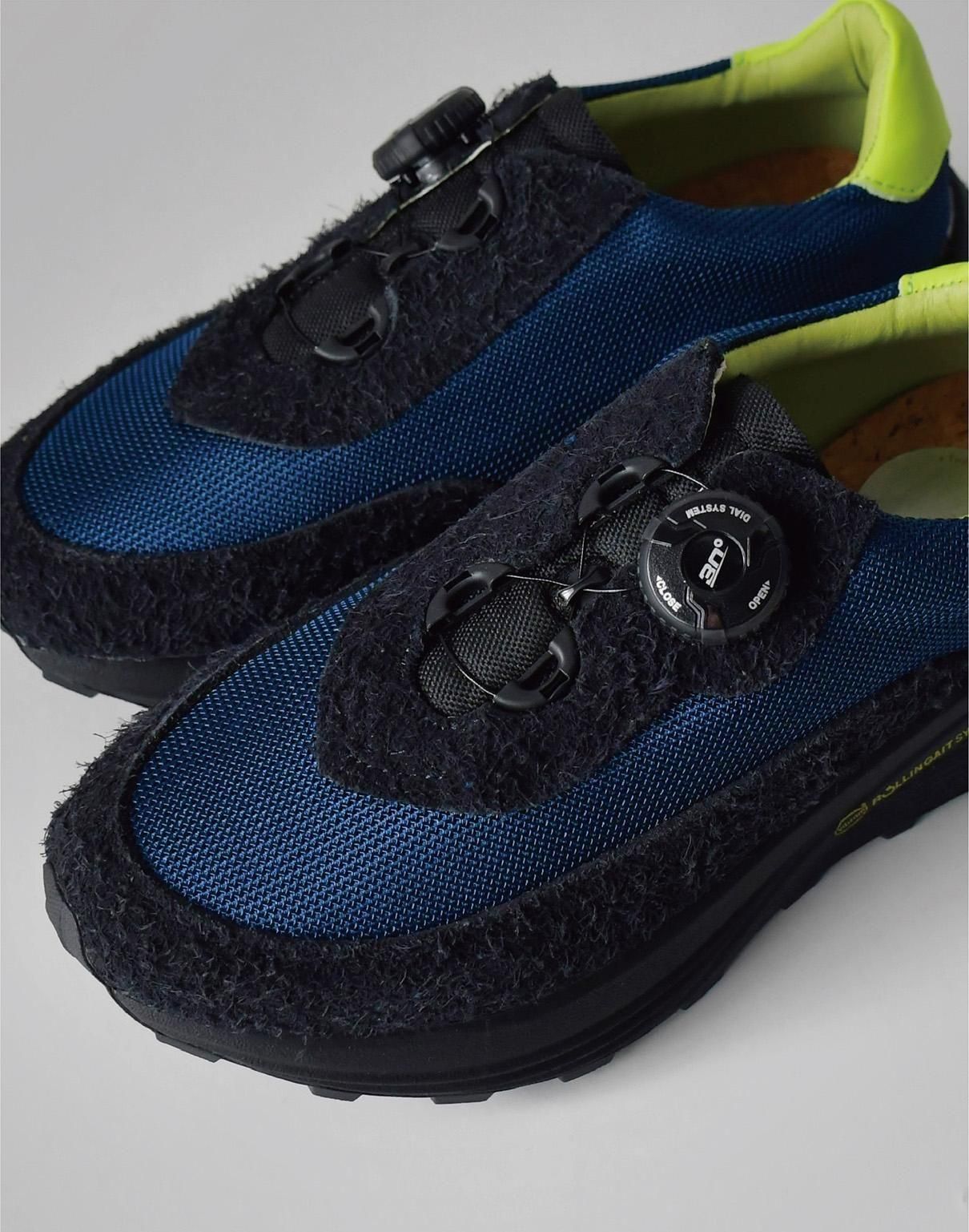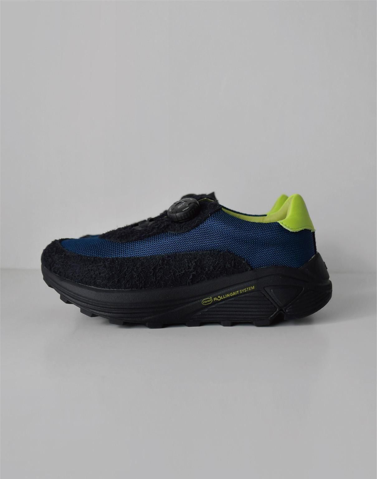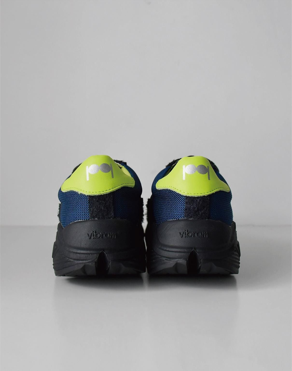 スエード部分の濃いネイビー、メッシュ部分のブルー、そして踵のライムイエロー。