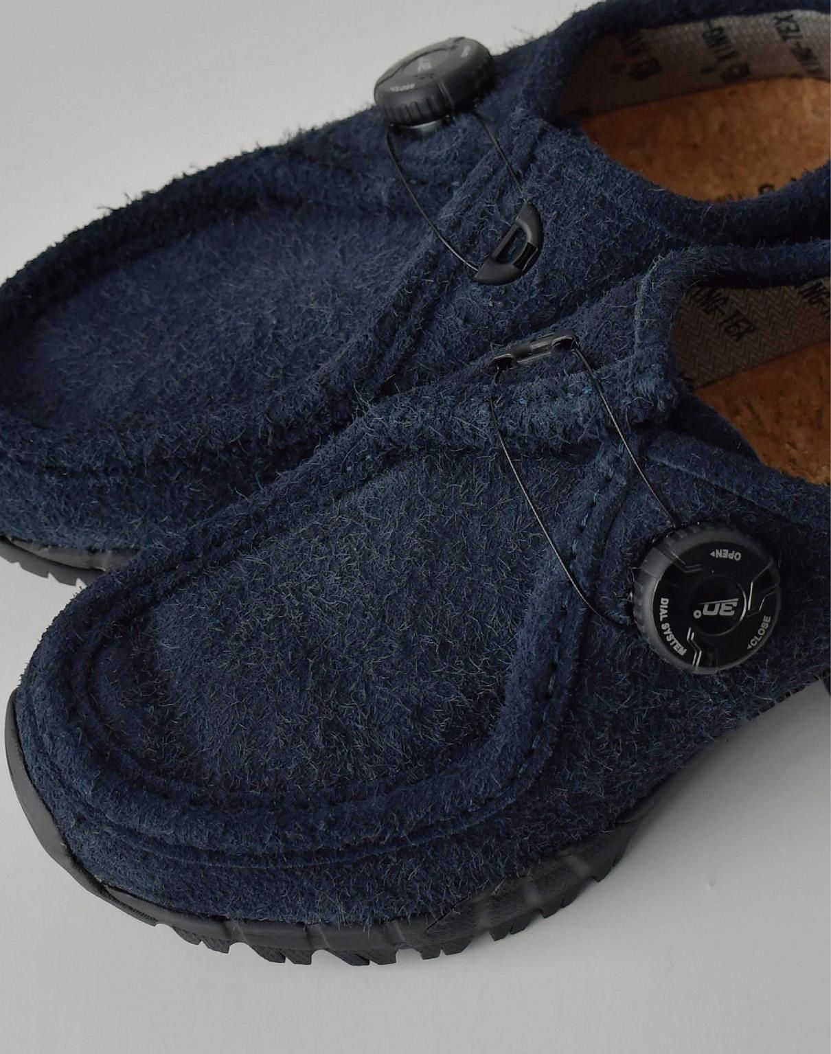 ネイビーのシャギースウェードにダイヤルロックの組み合わせ、